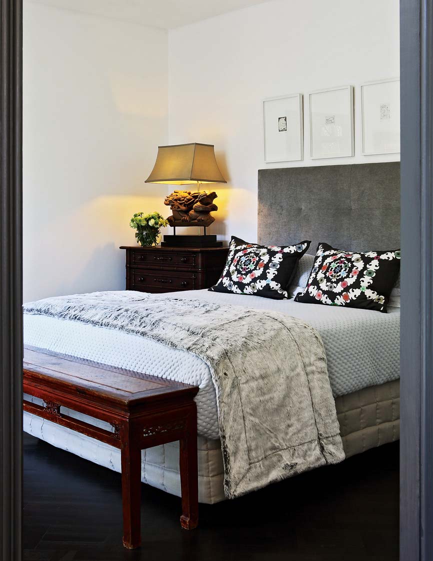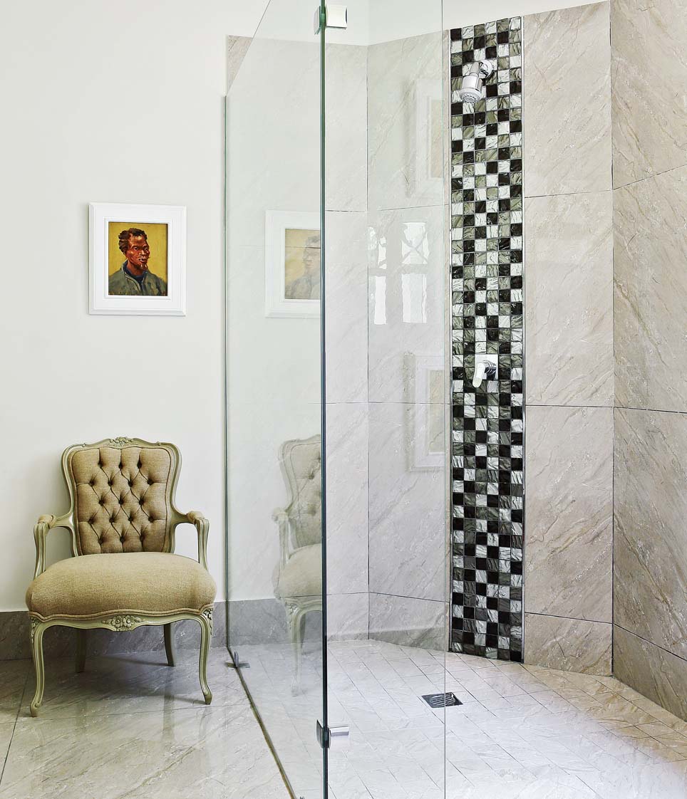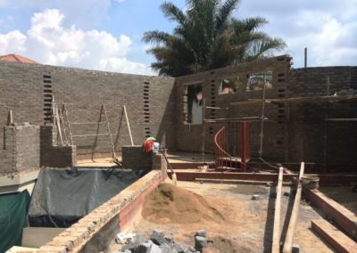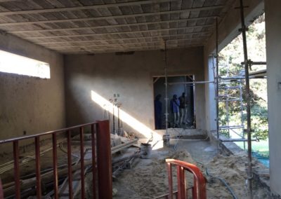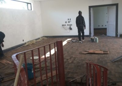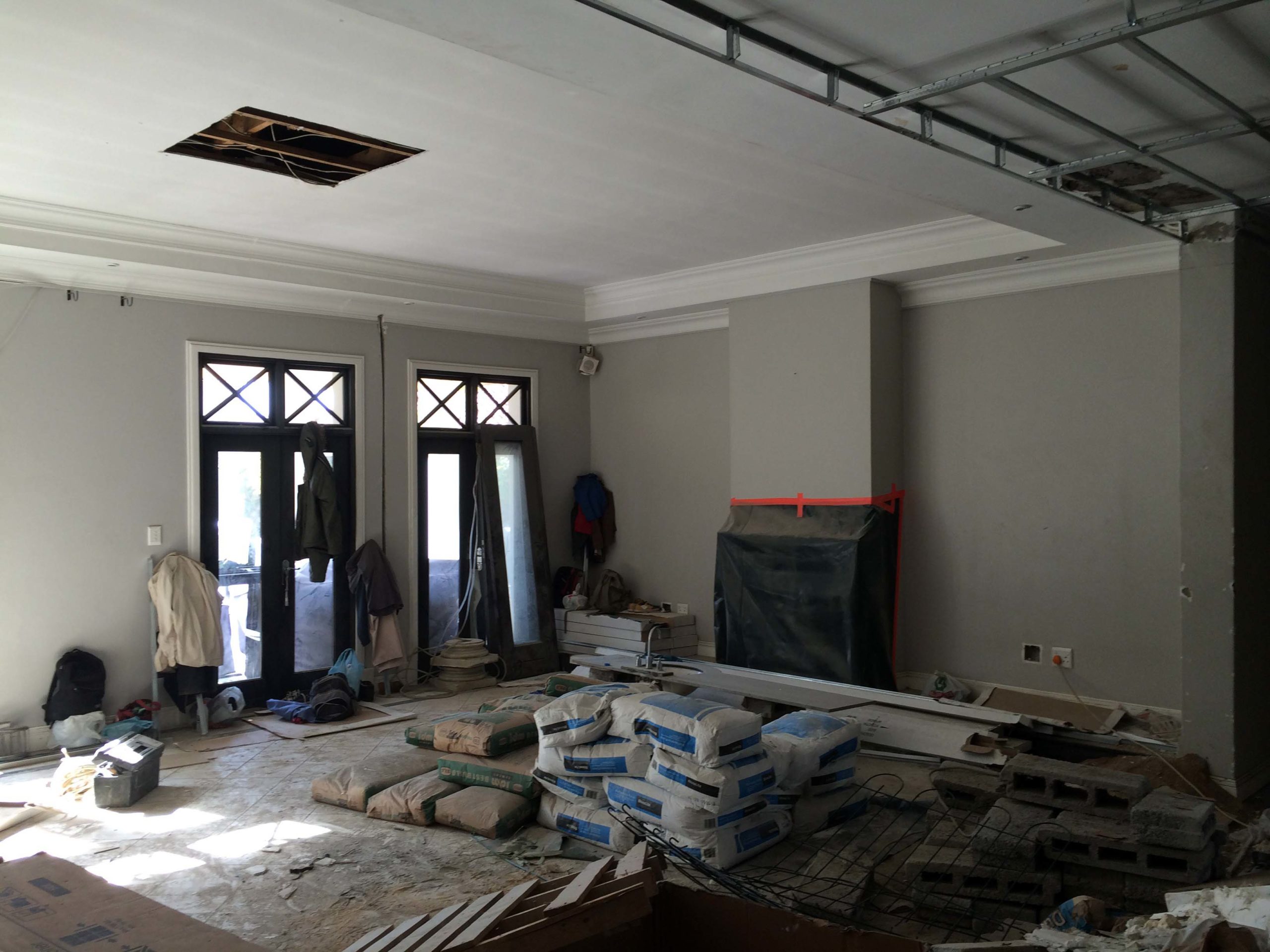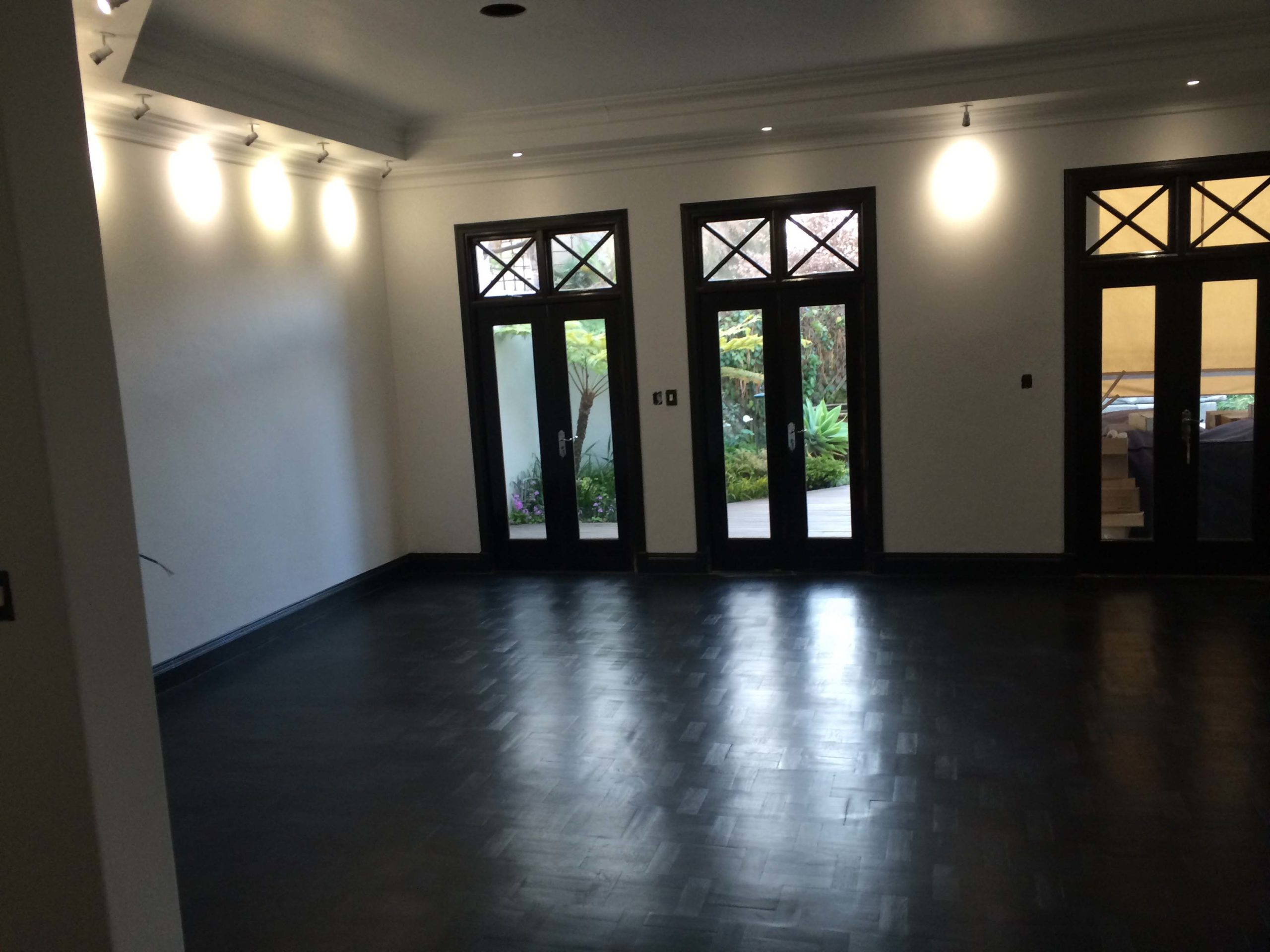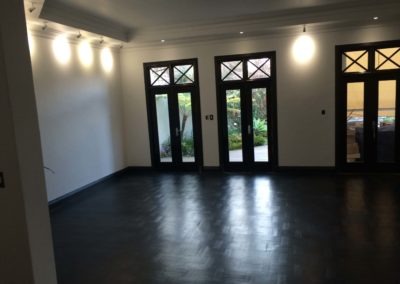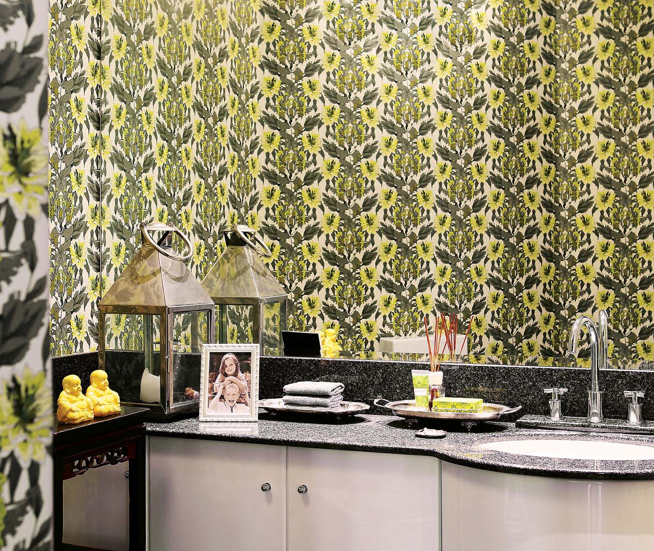 The entire space looks directly into giant trees on the neighboring golf course creating a feeling of working in a treehouse. The 4m desk with a floating glass top has created a generous workspace, and the contemporary, Asian style bookshelves add interest and display a lovely collection of research and beautiful books. All the office printers and filing/office requirements are concealed behind the doors in the bookshelves, thus giving this workspace a very comfortable and relaxed feel. A lounge area, two extra bedrooms and a small gym area was also included in this upstairs space. The floors were continued in the downstairs lounge and dining area, and the guest loo was given a fabulous overhaul with Abigail Borg wallpaper. We firmly believe that the guest loo should always have a bit of crazy in it.