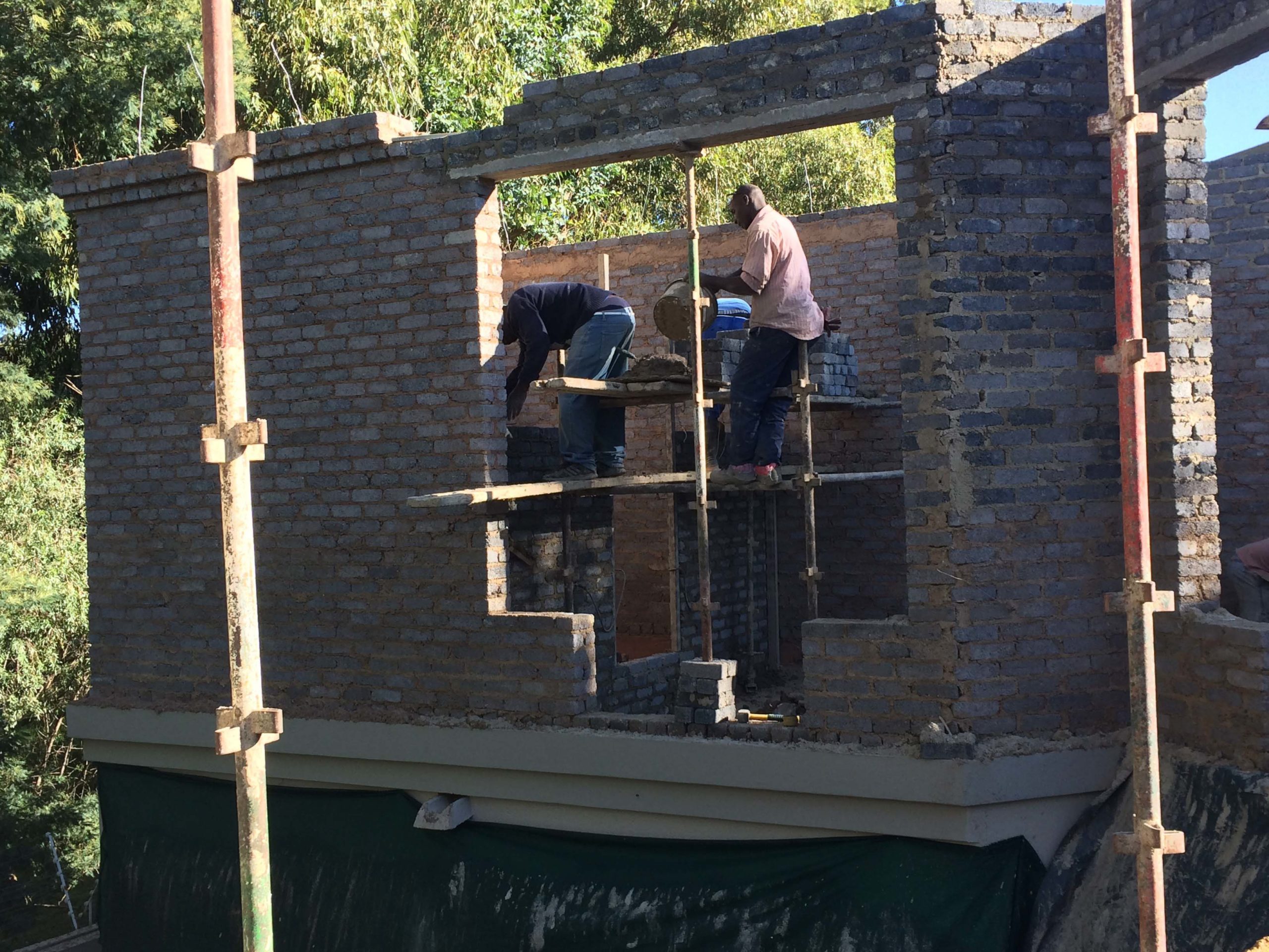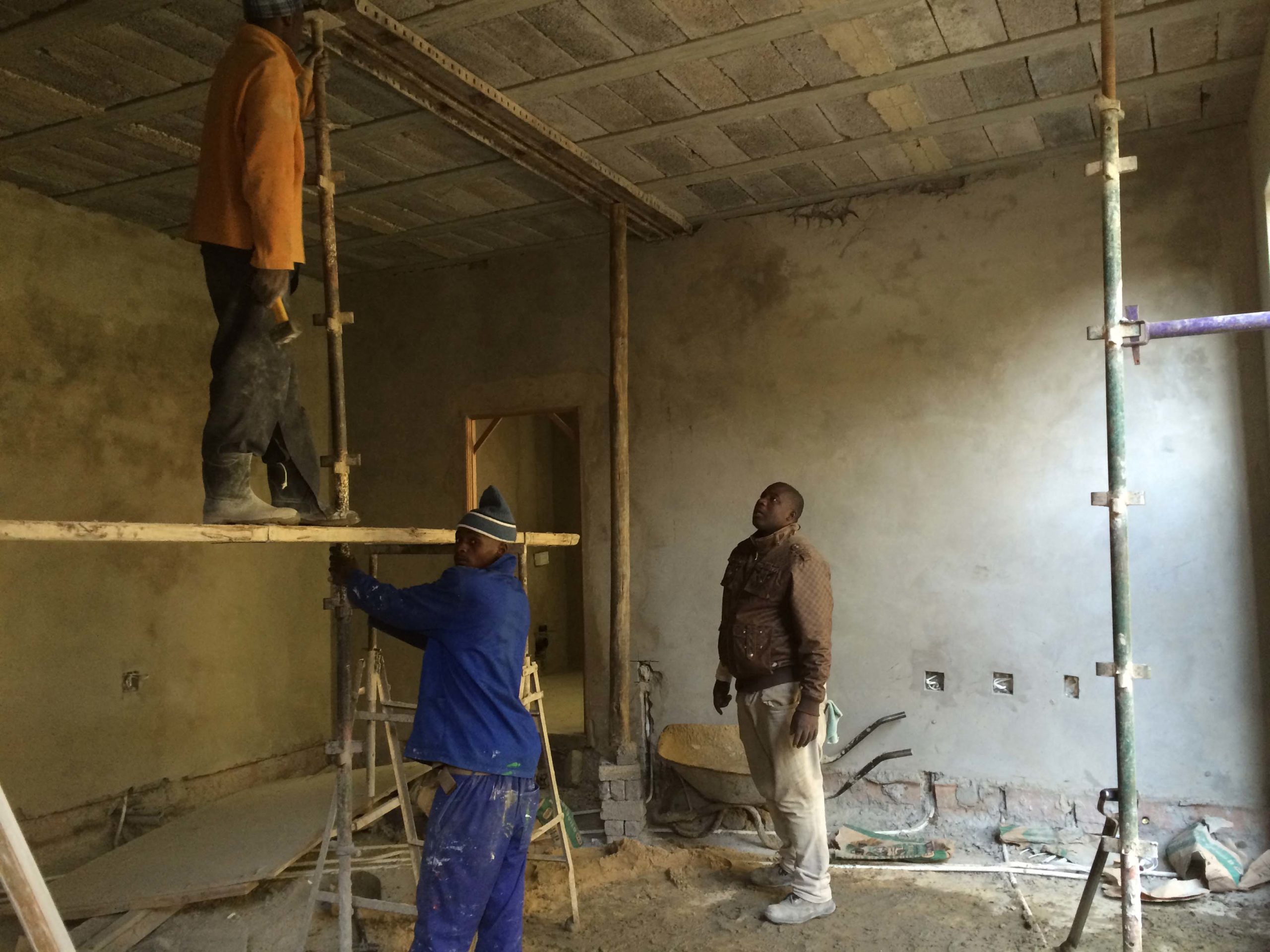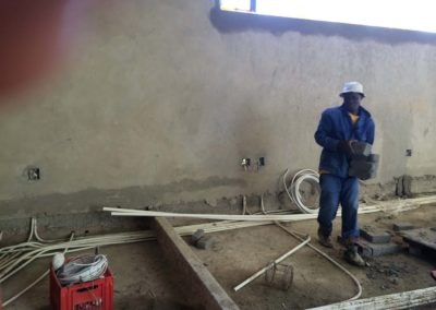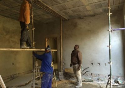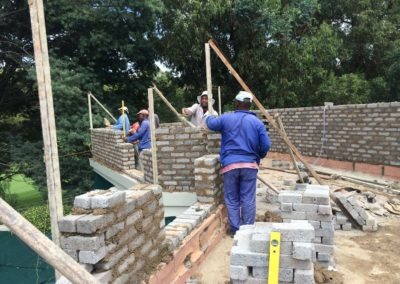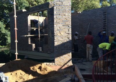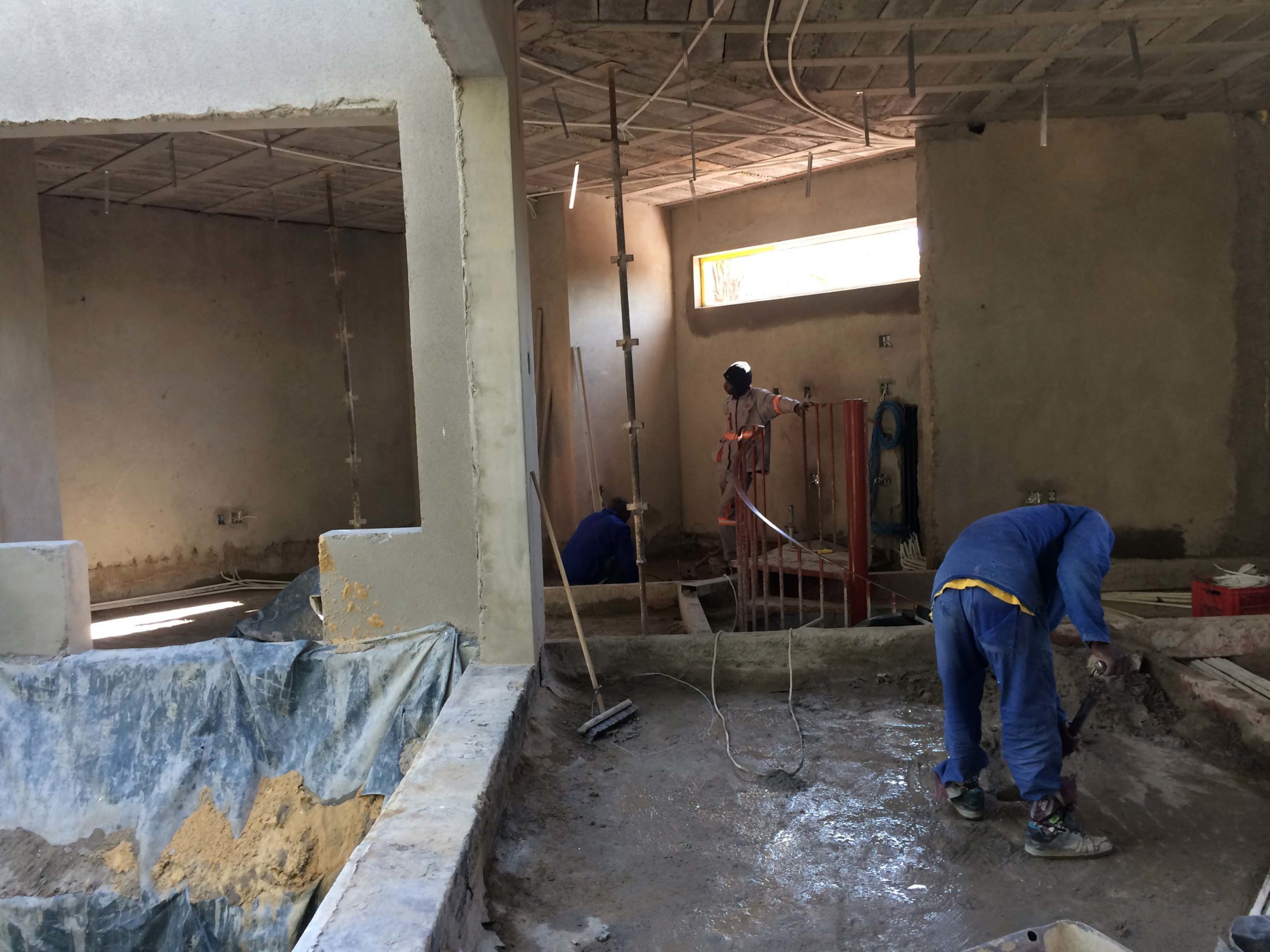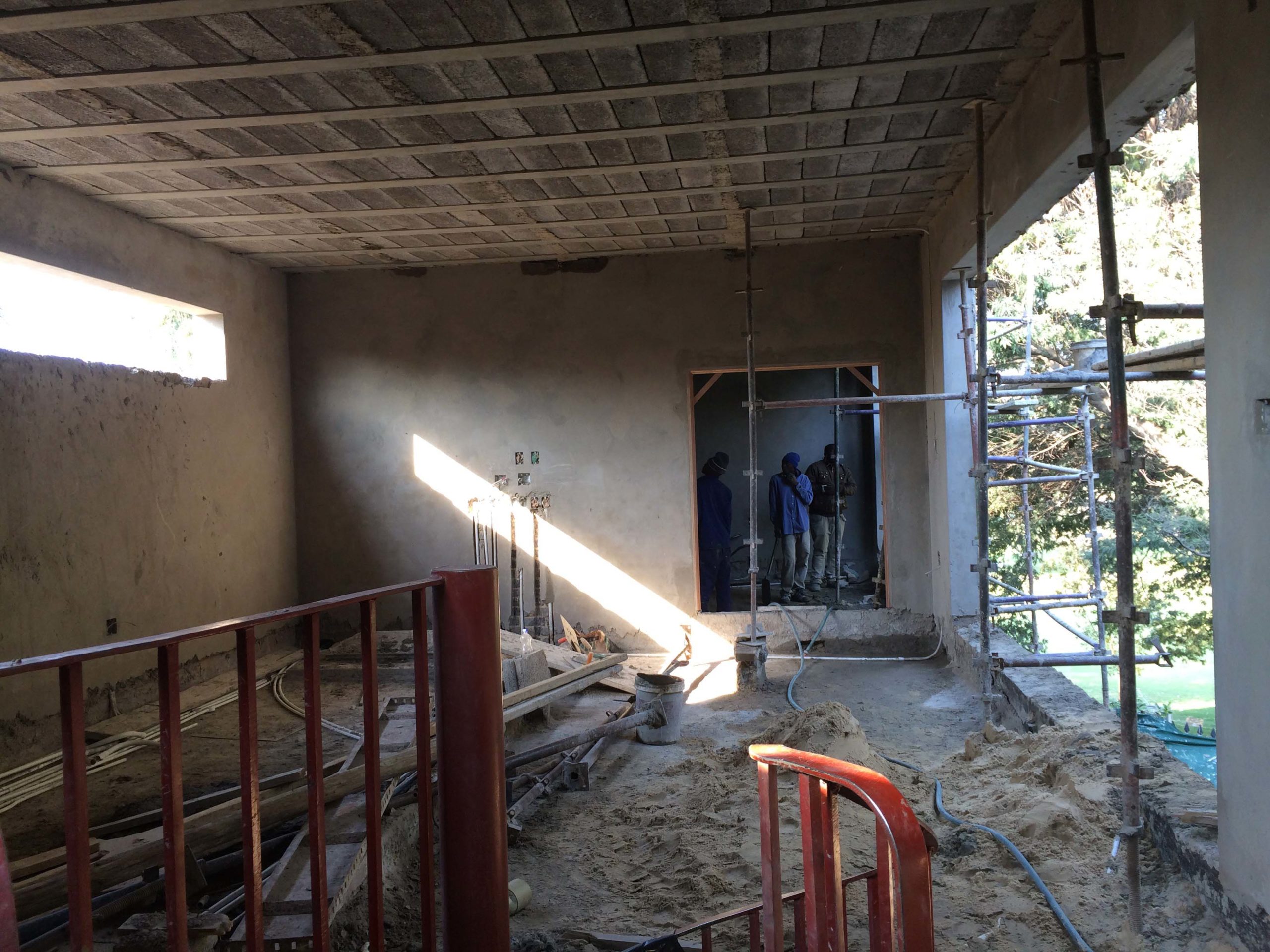 The entire space looks directly into giant trees on the neighboring golf course creating a feeling of working in a treehouse. The 4m desk with a floating glass top has created a generous workspace, and the contemporary, Asian style bookshelves add interest and display a lovely collection of research and beautiful books. All the office printers and filing/office requirements are concealed behind the doors in the bookshelves, thus giving this workspace a very comfortable and relaxed feel. A lounge area, two extra bedrooms and a small gym area was also included in this upstairs space. The floors were continued in the downstairs lounge and dining area, and the guest loo was given a fabulous overhaul with Abigail Borg wallpaper. We firmly believe that the guest loo should always have a bit of crazy in it.