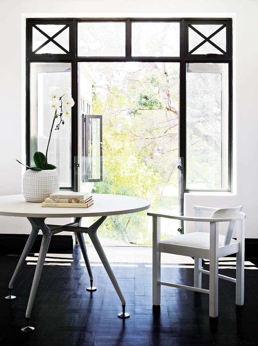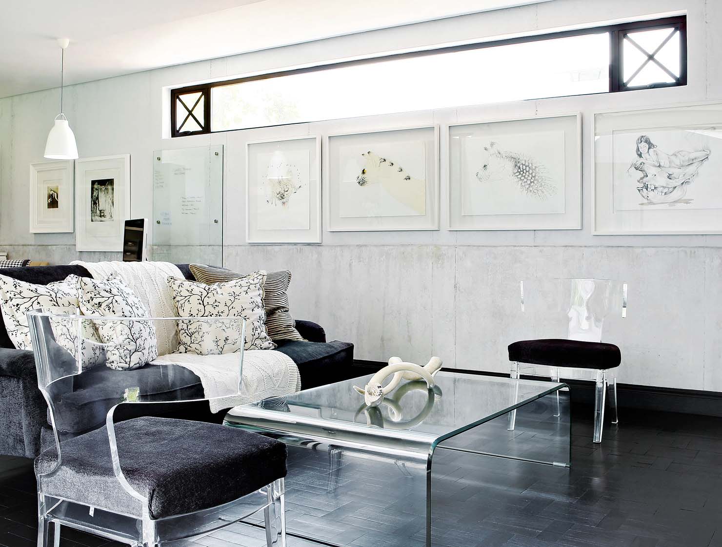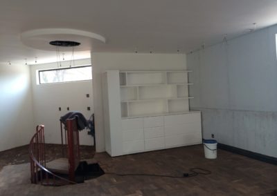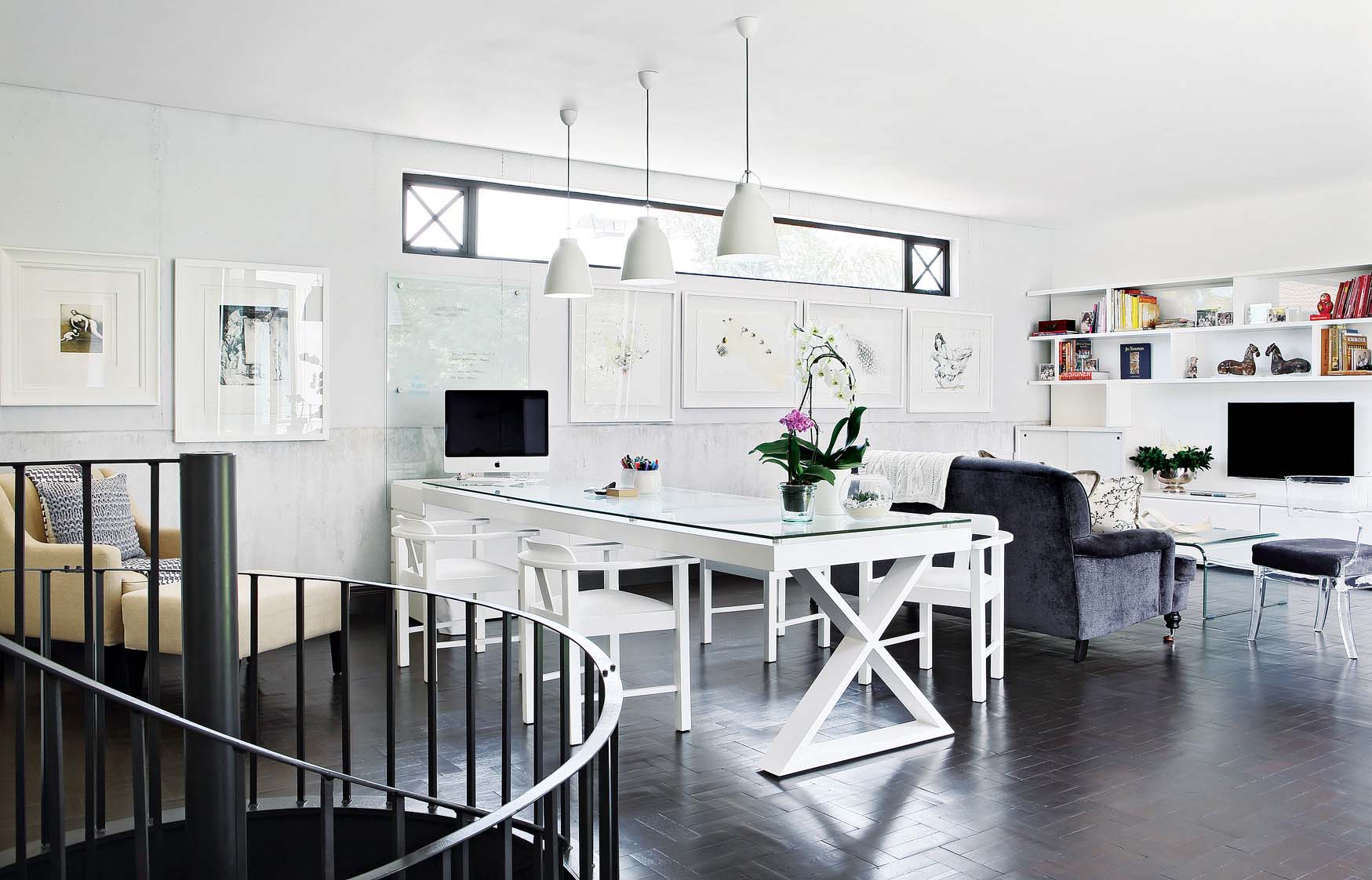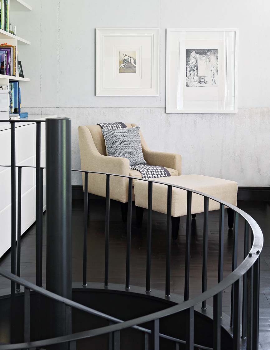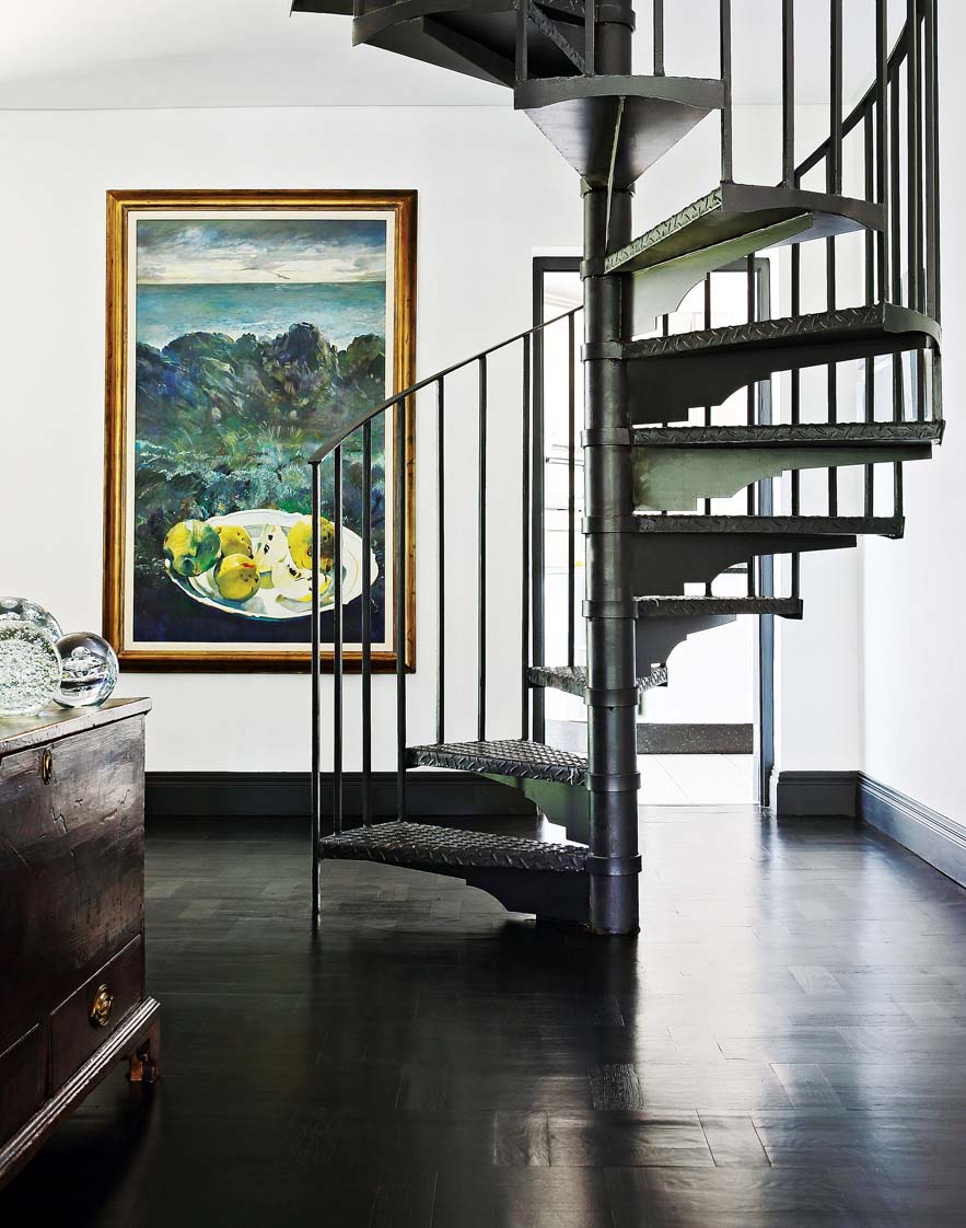 It was treated for rust and cut to size. It is an attractive feature and has worked exceptionally well. It was fortunate that the diameter was generous although we still ended up hoisting larger items of furniture up from the outside. The open plan design and floor to ceiling stacking doors, to the exterior, create a flow of energy that inspires those working in this space. A contrast of colours was used to create a dramatic effect enhancing the eclectic art collection and creating a New York apartment look and feel.