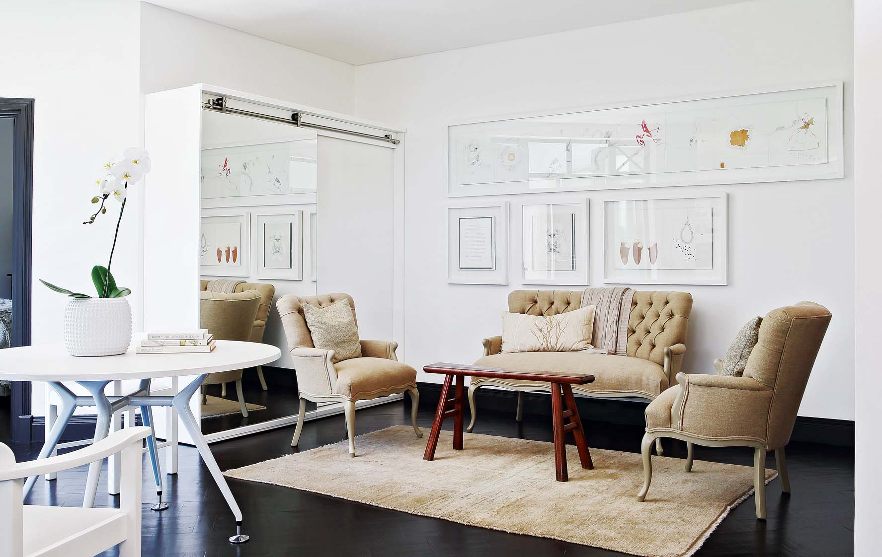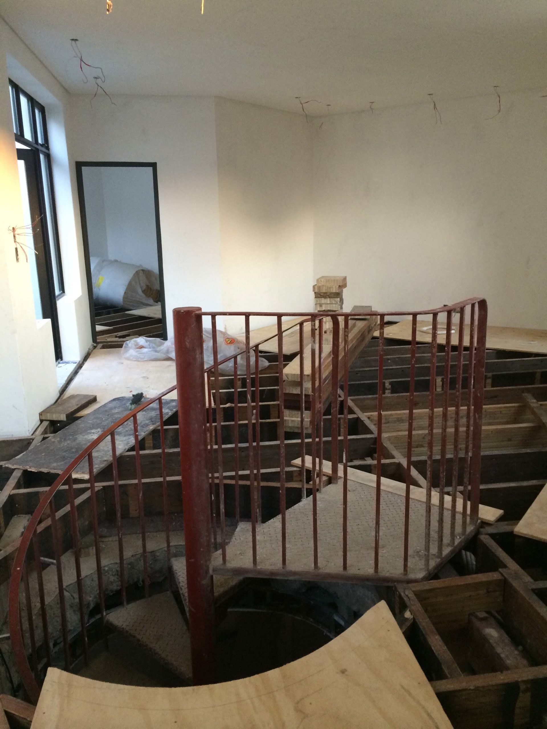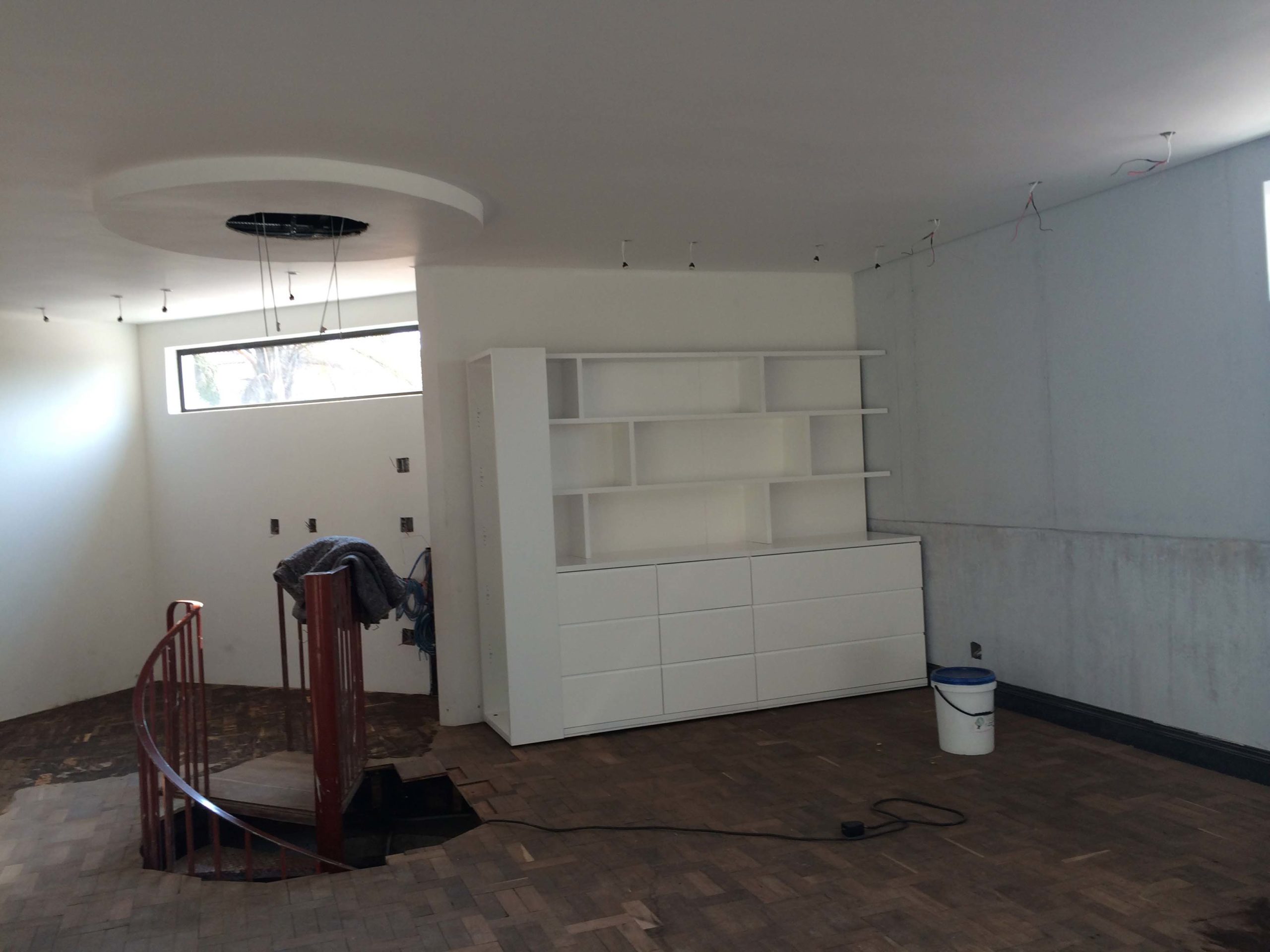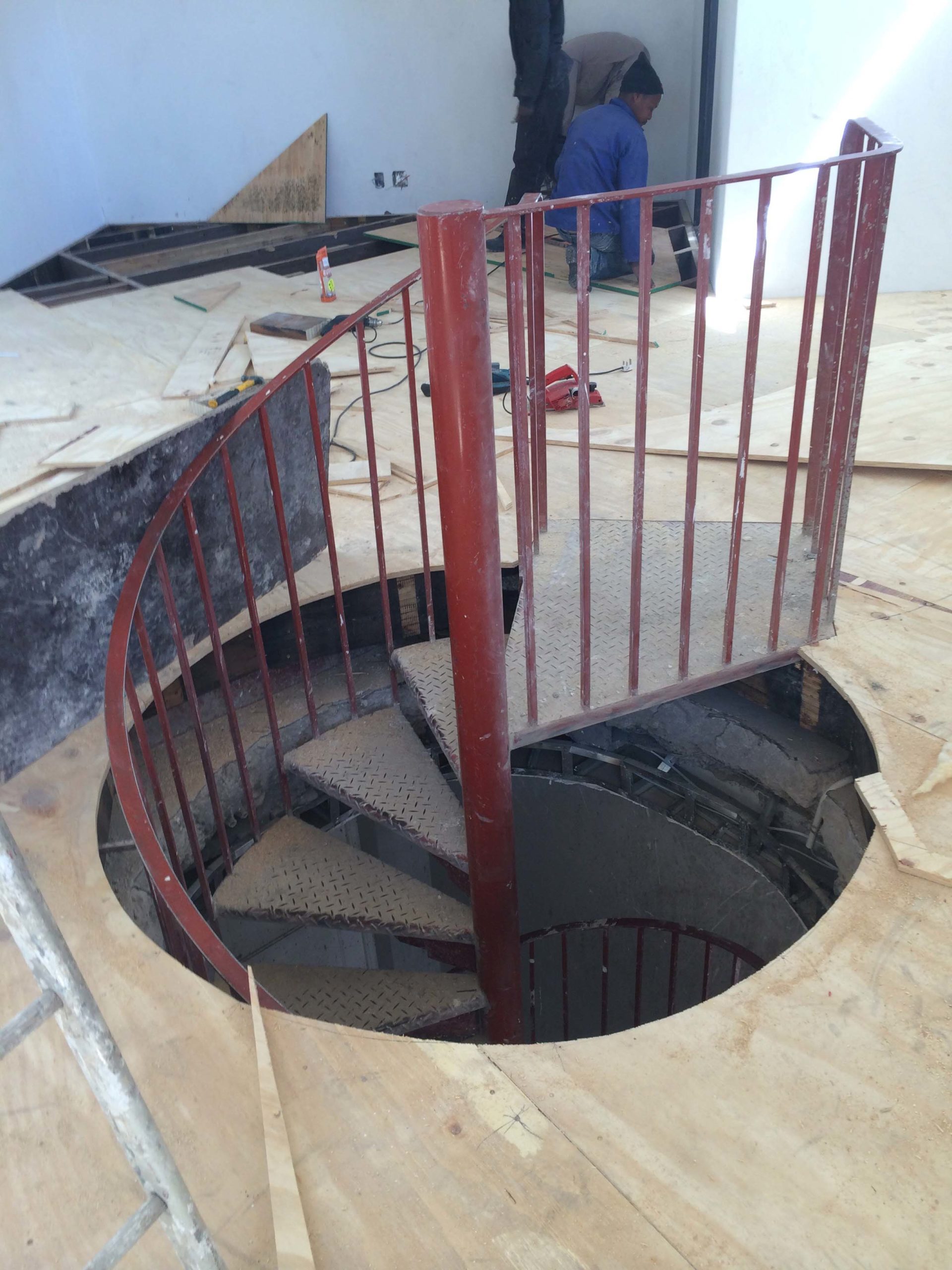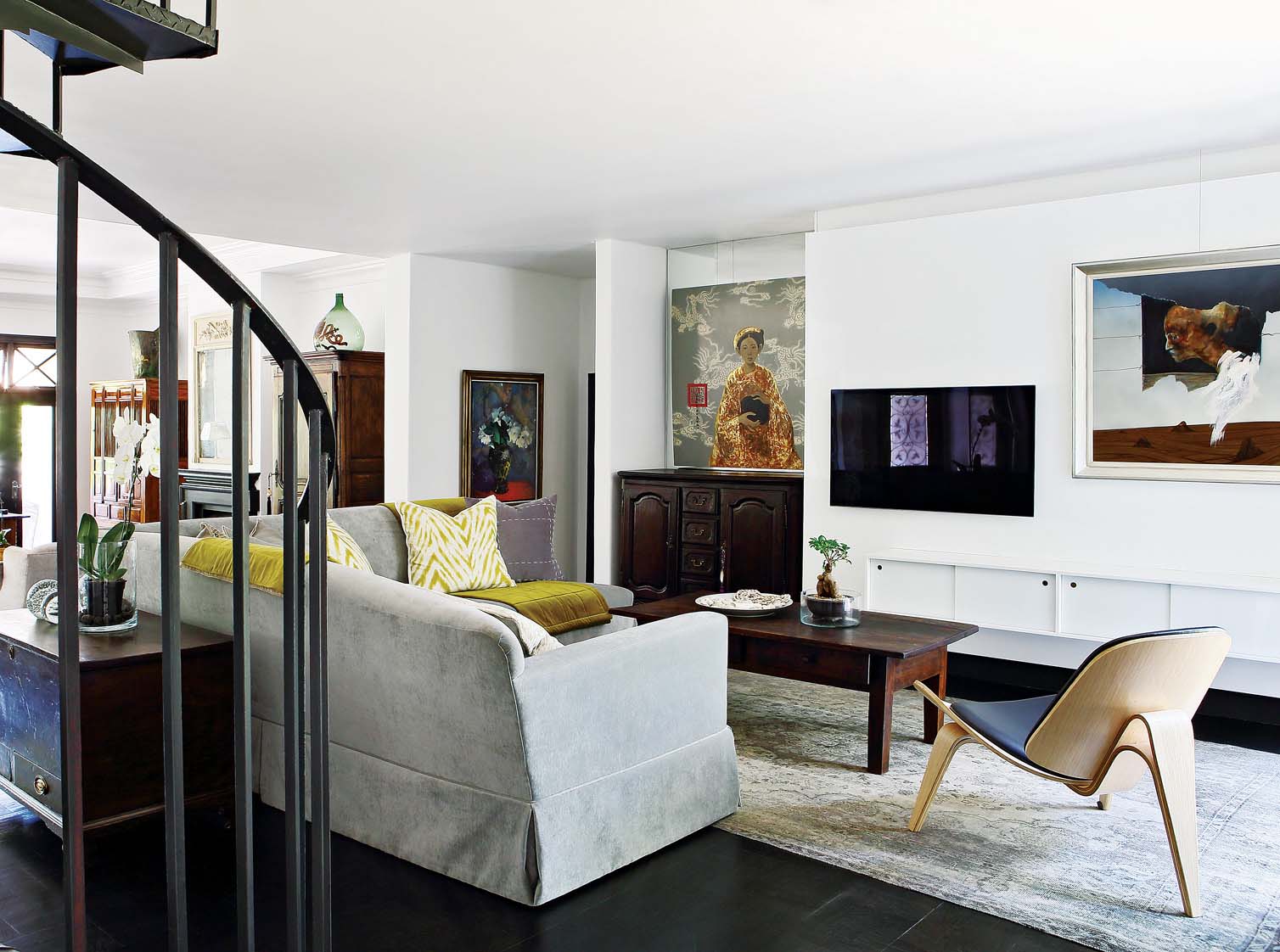 It was treated for rust and cut to size. It is an attractive feature and has worked exceptionally well. It was fortunate that the diameter was generous although we still ended up hoisting larger items of furniture up from the outside. The open plan design and floor to ceiling stacking doors, to the exterior, create a flow of energy that inspires those working in this space. A contrast of colours was used to create a dramatic effect enhancing the eclectic art collection and creating a New York apartment look and feel.